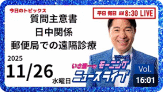 まっさんのなんでもブログ 【モーニングニュースライブ】11月26日(水)知ってほしい今日のニュースを厳選!いさ進一が生解説する新聞情報 ・ ニュースチェック【 10分解説 / 政治ニュース / 生配信 】をテキスト要約質問主意書の提出と政府答弁存立危機事態(台湾有事を想定)非核三原則日中関係の読み解き公明党の「中道改革」方針公明党サポーター制度「チームライス」郵便局を活用した遠隔診療米中・日米首脳会談選択的夫婦別姓いさ進一氏の視点と姿勢