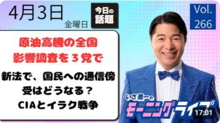 まっさんのなんでもブログ 動画を見る時間の無い方必見【モーニングライブ】2026年4月3日(金)知ってほしい今日のニュースを厳選!いさ進一が生解説する新聞情報【 15分解説 / 政治ニュース / 生配信 / 中道動画 】をテキスト要約冒頭:音声トラブルとチャンネル登録19万人達成中東情勢による物資不足の影響(後藤祐一議員の質問)医療用手袋などの不足問題厚労大臣の答弁サプライチェーン全体の調査を求める質問物価高対策担当大臣(赤沢大臣)の答弁公明党・立憲民主党・中道の3党で現場調査を開始国家情報会議設置法案(インテリジェンス強化)質問①:新たな通信傍受は行われるのか?質問②:情報収集の対象に「野党活動・デモ・選挙運動」は含まれるのか?質問③:情報機関が政策に影響を与える危険性まとめ