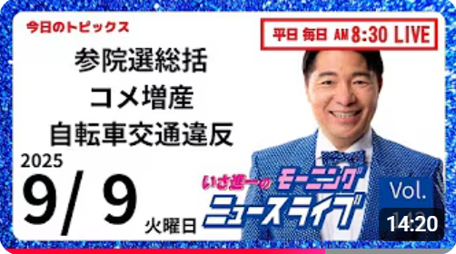 【モーニングニュースライブ】9/ 9(火)知ってほしい今日のニュースを厳選!いさ進一が生解説する新聞情報 ・ ニュースチェック【 10分解説 / 政治ニュース / 生配信 】
