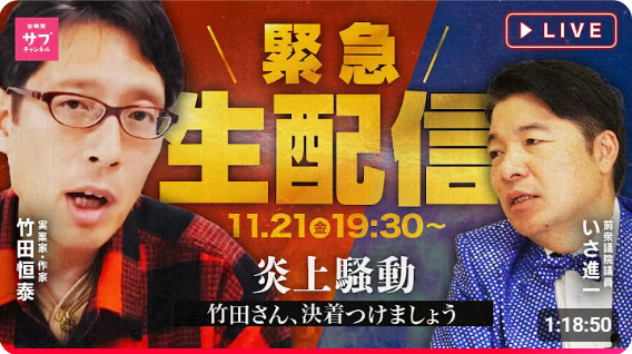 【竹田恒泰 vs 公明党・いさ進一】🔥 緊急生配信 🔥 ついに、サブチャンネルでの直接対談が実現! コメント欄からのご参加もお待ちしています!11月21日(金) 19:30〜ぜひリアルタイムでご覧ください!!!【出演】 ◼︎ 竹田恒泰 氏(...