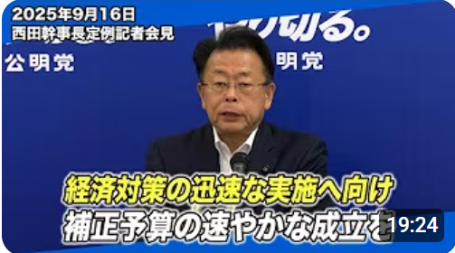まっさんのなんでもブログ 「公明党チャンネル 2025/9/16 西田幹事長定例記者会見」のテキスト要約