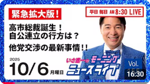 【モーニングニュースライブ】10/ 6(月)知ってほしい今日のニュースを厳選!いさ進一が生解説する新聞情報 ・ ニュースチェック【 10分解説 / 政治ニュース / 生配信 】