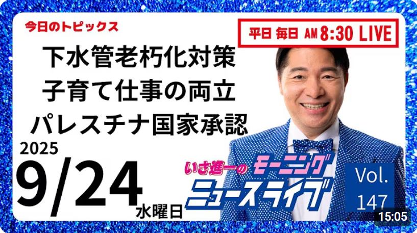 【モーニングニュースライブ】9/24(水)知ってほしい今日のニュースを厳選!いさ進一が生解説する新聞情報 ・ ニュースチェック【 10分解説 / 政治ニュース / 生配信 】