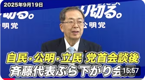 まっさんのなんでもブログ 公明党チャンネル 「2025/9/19 自公立 党首会談後 斉藤代表ぶら下がり会見」をテキスト要約