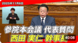 西田幹事長は「中道改革」を軸に社会保障改革やサポーター制度創設を進める方針を説明。外交では日米連携を重視し、存立危機事態の政府見解維持を確認。国内政治では衆院定数削減に慎重姿勢を示し、比例削減を「民意の排除」と批判。解散総選挙は「政治空白を避けるべき」と否定的。経済対策は生活者支援不足を指摘し修正を検討。歳費引き上げやスパイ防止法にも慎重な立場を示した。
