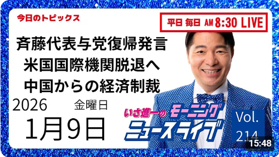 まっさんのなんでもブログ【モーニングニュースライブ】2026年1月9日 知ってほしい今日のニュースを厳選!いさ進一が生解説する新聞情報 ・ ニュースチェック【 10分解説 / 政治ニュース / 生配信 】をテキスト要約