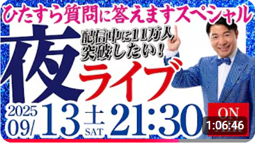まっさんのなんでもブログ【質問に答えます】 (9月13日)NGなしで質問返しします! 生配信中に11万人登録者突破したい! 前衆議院議員 いさ進一 夜ライブ 【特別配信】をテキストで要約