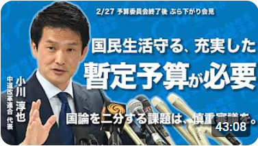 まっさんのなんでもブログ 動画を見る時間の無い方必見「中道改革連合チャンネル 2026年2月27日 【予算委員会終了後】 小川代表 ぶら下がり会見 国民生活を守るために|暫定予算の必要性を提起」をテキスト要約
