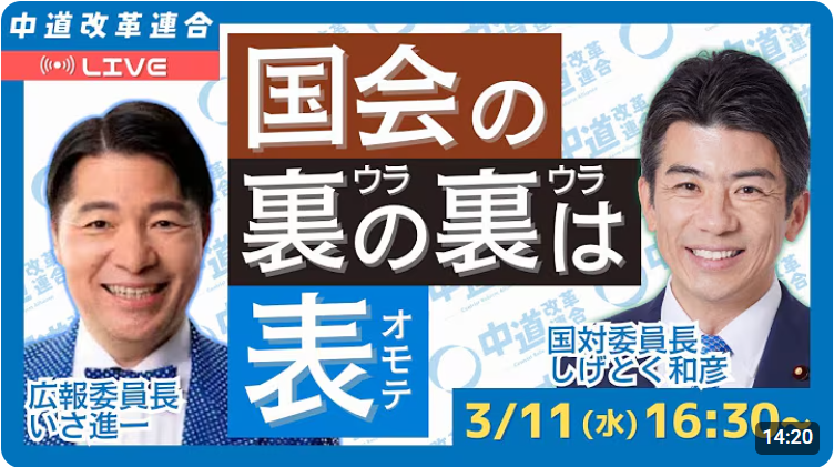 まっさんのなんでもブログ 動画を見る時間の無い方必見「中道改革連合チャンネル 2026年3月11日 国会の裏の裏は表 国会の今この瞬間をライブ配信します!」をテキスト要約