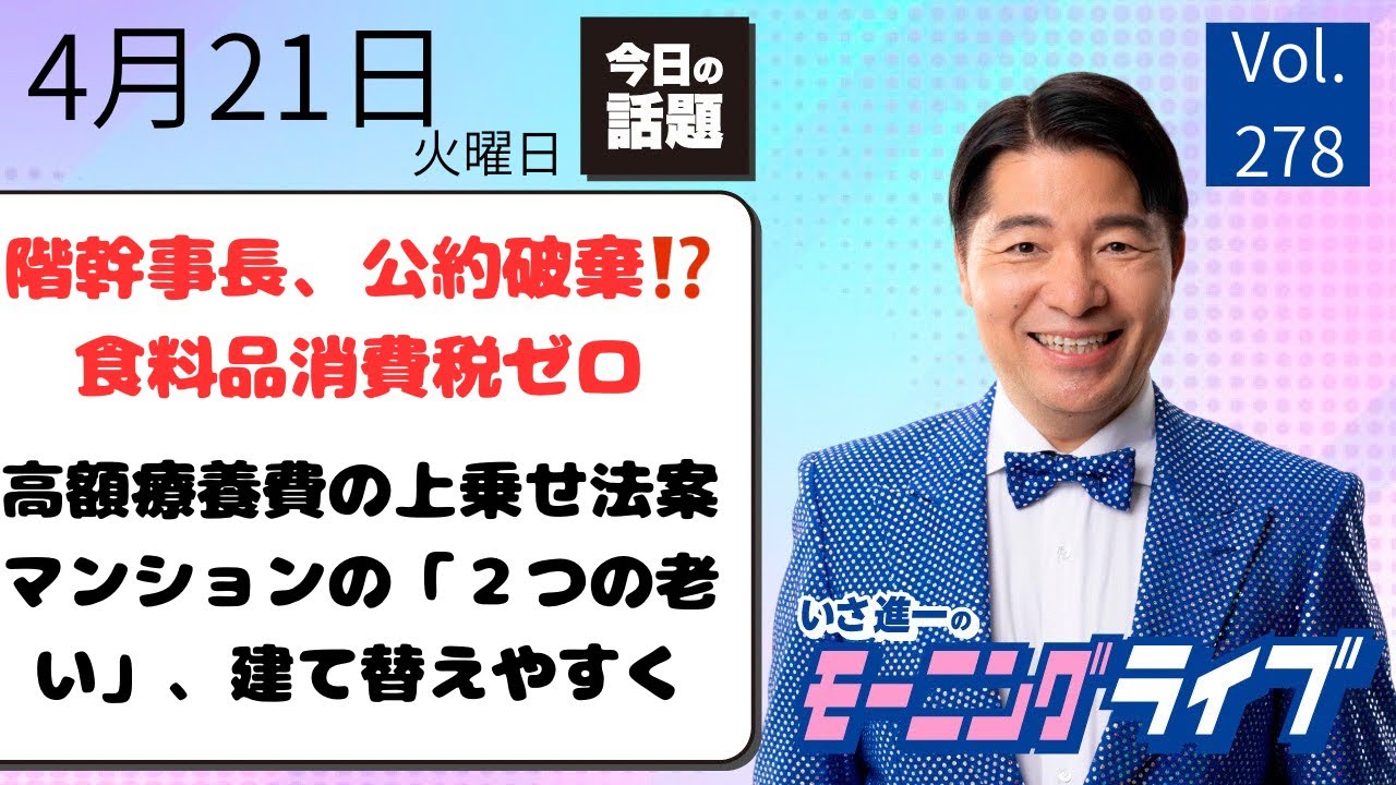まっさんのなんでもブログ 動画を見る時間の無い方必見【モーニングライブ】2026年4月21日(火)知ってほしい今日のニュースを厳選!いさ進一が生解説する新聞情報【 15分解説 / 政治ニュース / 生配信 / 中道動画 】をテキスト要約