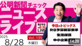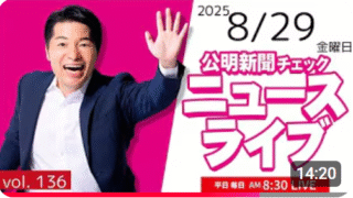 公明動画をテキスト要約 まっさんのなんでもブログ「8/28(木)いさ進一の公明新聞記事チェック 今日のニュースを厳選して生解説」の要約 ライブ配信の振り返り政策・予算関連の話題財源なき減税への懸念子どものメンタルヘルス生活保護引き下げ裁判中小企業の価格転嫁問題地元議員の紹介 2025.08.29 公明動画をテキスト要約