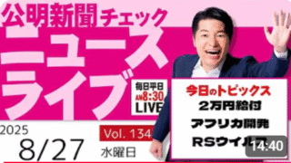 公明動画をテキスト要約 まっさんのなんでもブログ「8/27(水)いさ進一の公明新聞記事チェック 今日のニュースを厳選して生解説」の要約 豪雨災害への対応2万円給付の行方ガソリン税の暫定税率廃止エッセンシャルワーカーの賃上げ企業団体献金の見直しアフリカ開発と国際交流RSウイルス対策その他の話題 2025.08.28 公明動画をテキスト要約