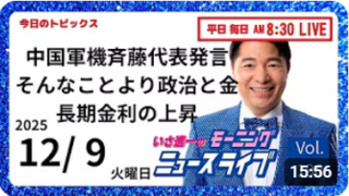 まっさんのなんでもブログ 【モーニングニュースライブ】12月9日(火)知ってほしい今日のニュースを厳選!いさ進一が生解説する新聞情報 ・ ニュースチェック【 10分解説 / 政治ニュース / 生配信 】をテキスト要約冒頭トーク中国戦闘機のレーダー照射と「偶発的事象」発言補正予算と家計支援政治改革:企業団体献金と定数削減長期金利の上昇と財政懸念中国とのホットライン機能不全SNS利用と子どもの安全