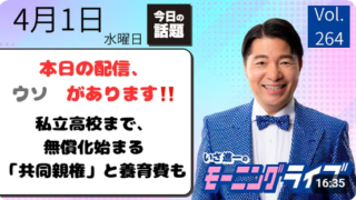 まっさんのなんでもブログ 動画を見る時間の無い方必見【モーニングライブ】2026年4月1日(水)知ってほしい今日のニュースを厳選!いさ進一が生解説する新聞情報【 15分解説 / 政治ニュース / 生配信 / 中道動画 】をテキスト要約新年度スタート・エイプリルフール宣言子ども誰でも通園制度(本格スタート)子ども・子育て支援金の徴収開始高校授業料の実質無償化(私立も所得制限撤廃)給食費支援(1人あたり5200円)“年収の壁”対策(130万円の壁)在職老齢年金の基準額引き上げ物価・税制・住宅関連の変更離婚後の「共同親権」制度スタート(民法大改正)1947年以来の大改革共同親権の範囲DV・虐待がある場合養育費の強化親子交流の確保その他